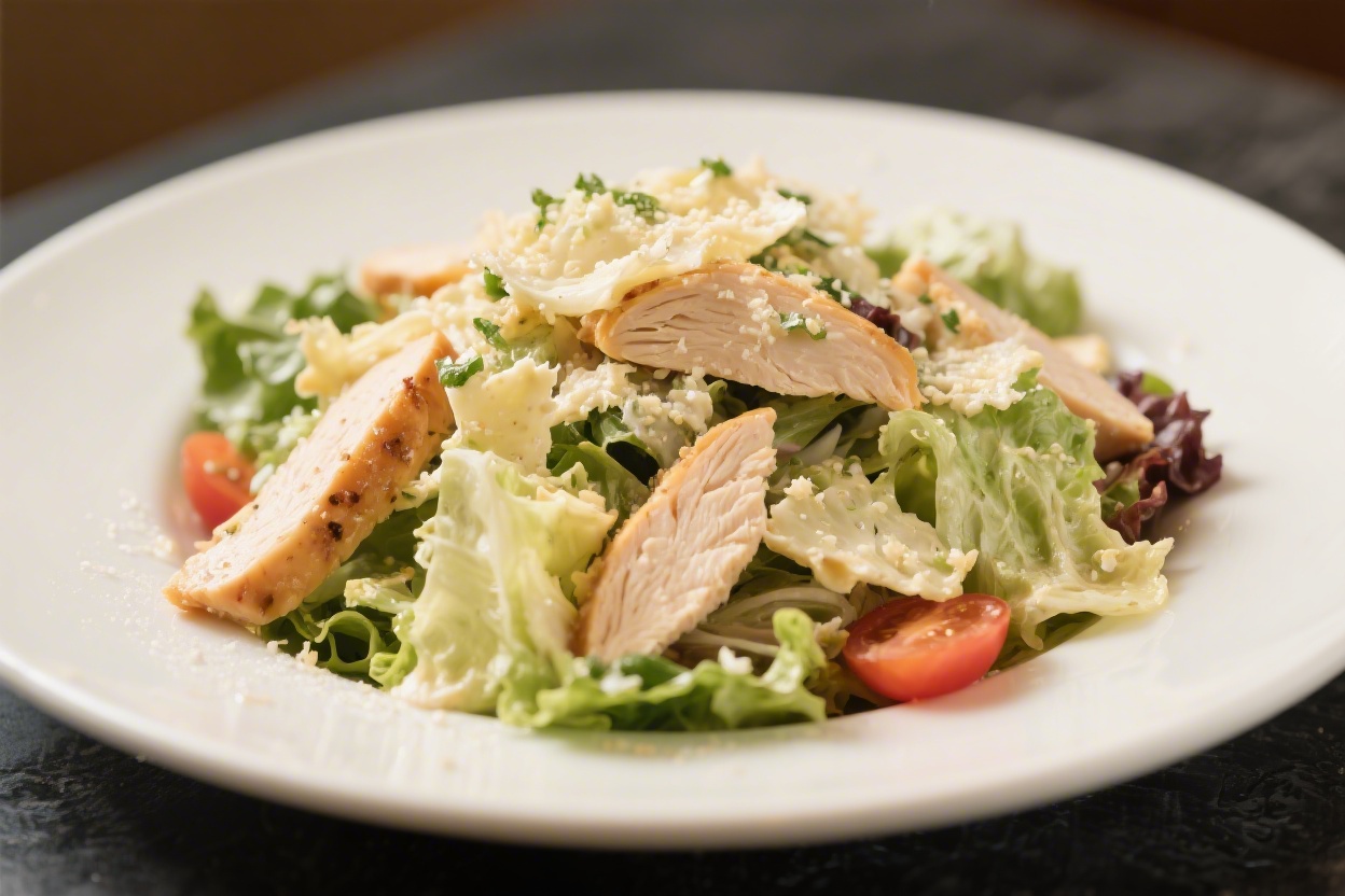 - Add chicken and extras: Top with sliced chicken, remaining Parmesan, and more croutons. Add tomatoes or avocado if you like.